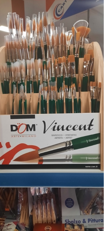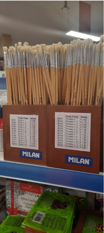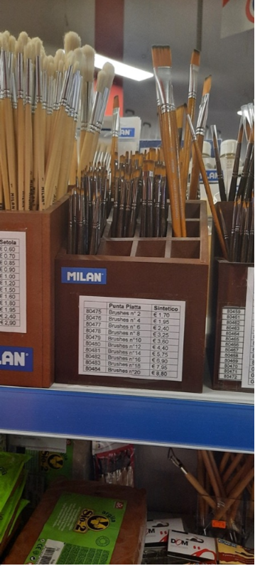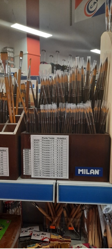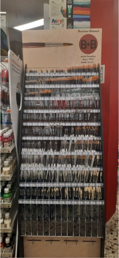 Un intero scaffale è dedicato ai pennelli, di tutte le qualità e dimensioni, pennelli con pelo naturale o sintetico, adatti a tutti i vari tipi di pitture. Pennelli Vincent, Milan e Borciani Bonazzi.